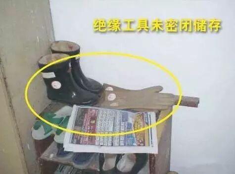 排查依据:DB 11527-2008《变配电室安全管理规范》5.18.5 绝缘靴、绝缘手套应存放在密闭的橱内,并与其他工具一表分开存放。