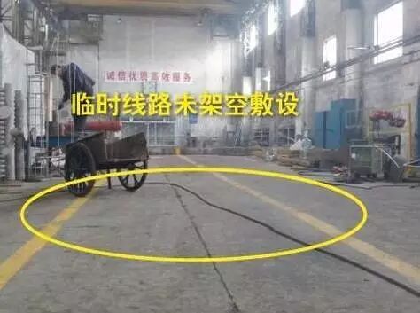 排查依据:《电气安全管理规程》(机械工业部[86]机生字 76号)第20条 临时线路必须采用绝缘良好的导线,应用电杆沿墙用合格瓷瓶固定架设,导线距地面的高度室内应不低于2.5m。