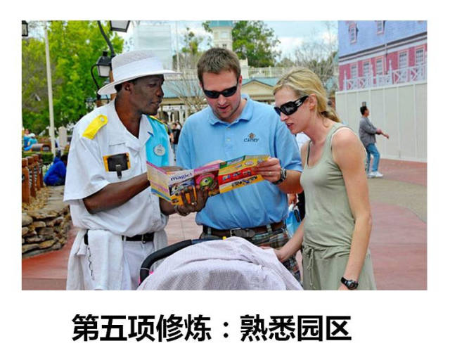 牢记所有游乐设施和公共设施的方位。如遇游客询问,清洁工们要在第一时间告知各个游乐项目的前往路线和诸如最近的卫生间、餐厅、出口、急救站等公共设施的具体位置。对于园区的熟悉度,他们需要极致到当游客向人问路时能答出:“洗手间在右前方,左拐,向前50米的那个红色的房子。”“左下方7点钟方向前进150米,有个灰色的房子能买到可乐。”每一位清洁工都要把整个迪士尼的平面图刻进脑子里,哪怕是第一天工作,也不能对问路的顾客说:“我刚来,我也不知道!”