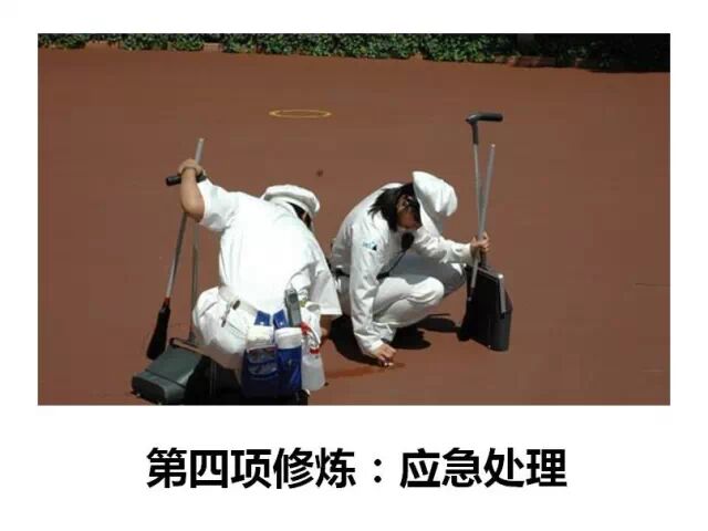 这三种扫帚的形状不一样,用法也不一样。怎么扫树叶才不会飘起来?怎么刮才能把地上的纸屑清干净?怎么掸灰尘才不会乌烟瘴气?这三项基本功大约需要半天的时间才可以练好。而后,他们必须牢牢记住并遵守几条规定:公园开门的时候、关门的时候、中午吃饭的时候,都不能进行清扫工作;在身边1.5米的范围内有游客经过时,也不可以再挥动你的扫帚。