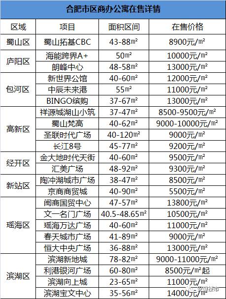 合肥市备案成交的商办产权公寓项目已有64个,目前市区有23个热门商办产权公寓项目在售,在售公寓的主力户型集中在40-70㎡,而且大多数项目的在售均价集中在8000-14000元/㎡。